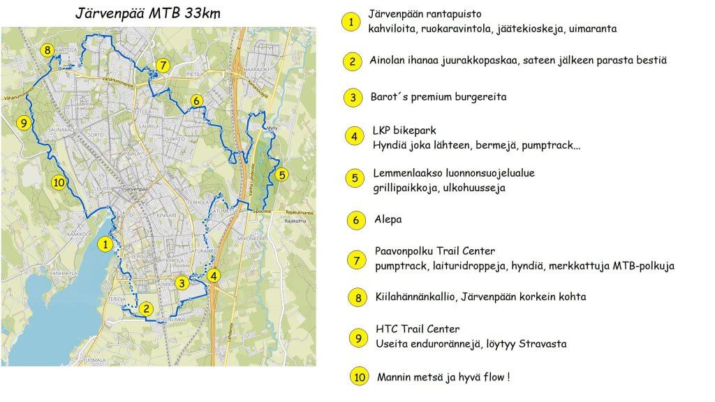Tässäpä reitti joka risteilee läpi lähiseutujen MTB-hotspotit, joihin kuuluu Firan hyppyrit ja rollikalliot, Mätäkiven endurobaanat ja Korson XC-rata. Vaikka itse reittijälki on vain 13 kilometriä, tulee reissusta yleensä pidempi jos hyppyreitä tai enduroreittejä haluaa hinkata enemmänkin. Reitti starttaa Maisalantie 133, Tuusula, parkkipaikalta, sillä siellä on useimmiten paremmin tilaa kuin vaikka alueen keskellä sijaitsevalla Raition parkkiksella.