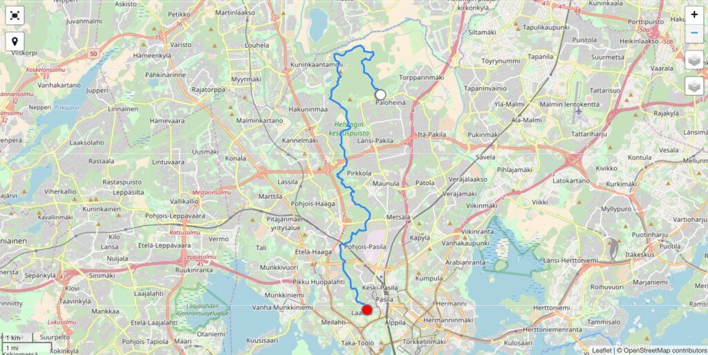 Reitillä on pituutta yhteen suuntaan 17,3 km ja Laaksosta Paloheinään ajaessa nousua 177 m.