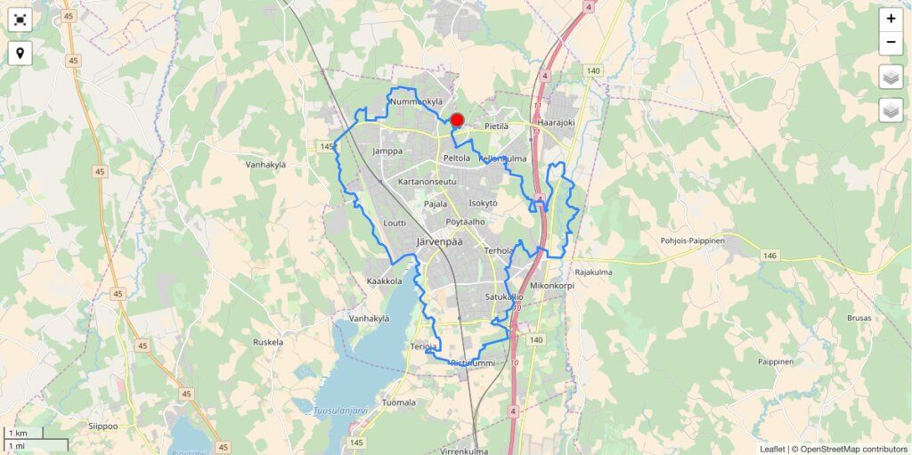 Reitti jäljen mukaan ajettuna on 13 km ja nousua 153 m.