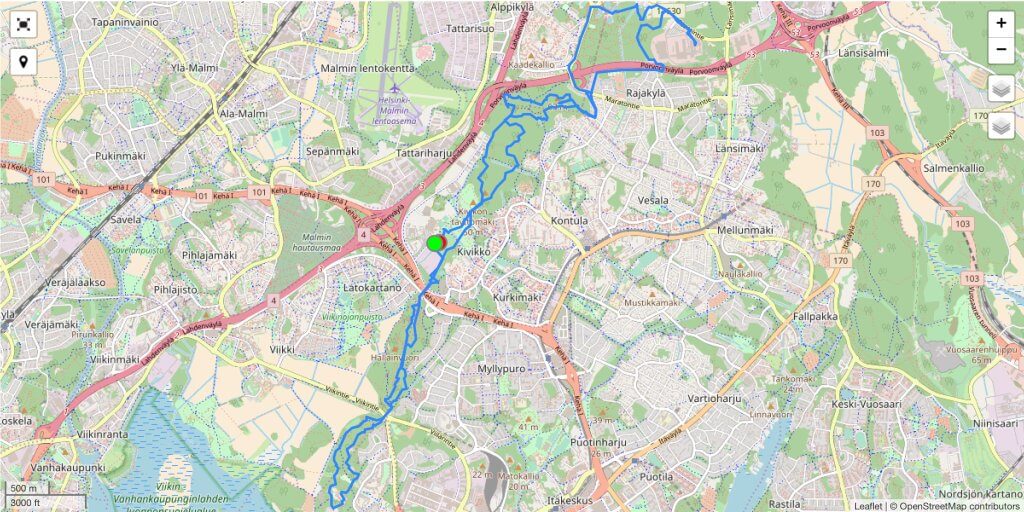 Tämä reittijälki lähtee Kivikosta, urheilupuiston parkkipaikalta, mutta voit lähteä reitille myös Herttoniemen urheilupuistosta tai vaikka Fazerin parkkipaikalta. Reitti on hyvä pohja alueeseen tutustumiseen. Hallainvuorella ja Kivikossa on paljon muutakin ajettavaa. Trailmap näyttää ne ja lisää polkuja löytyy vaikka Jakomäestä ja Länsimäestä.