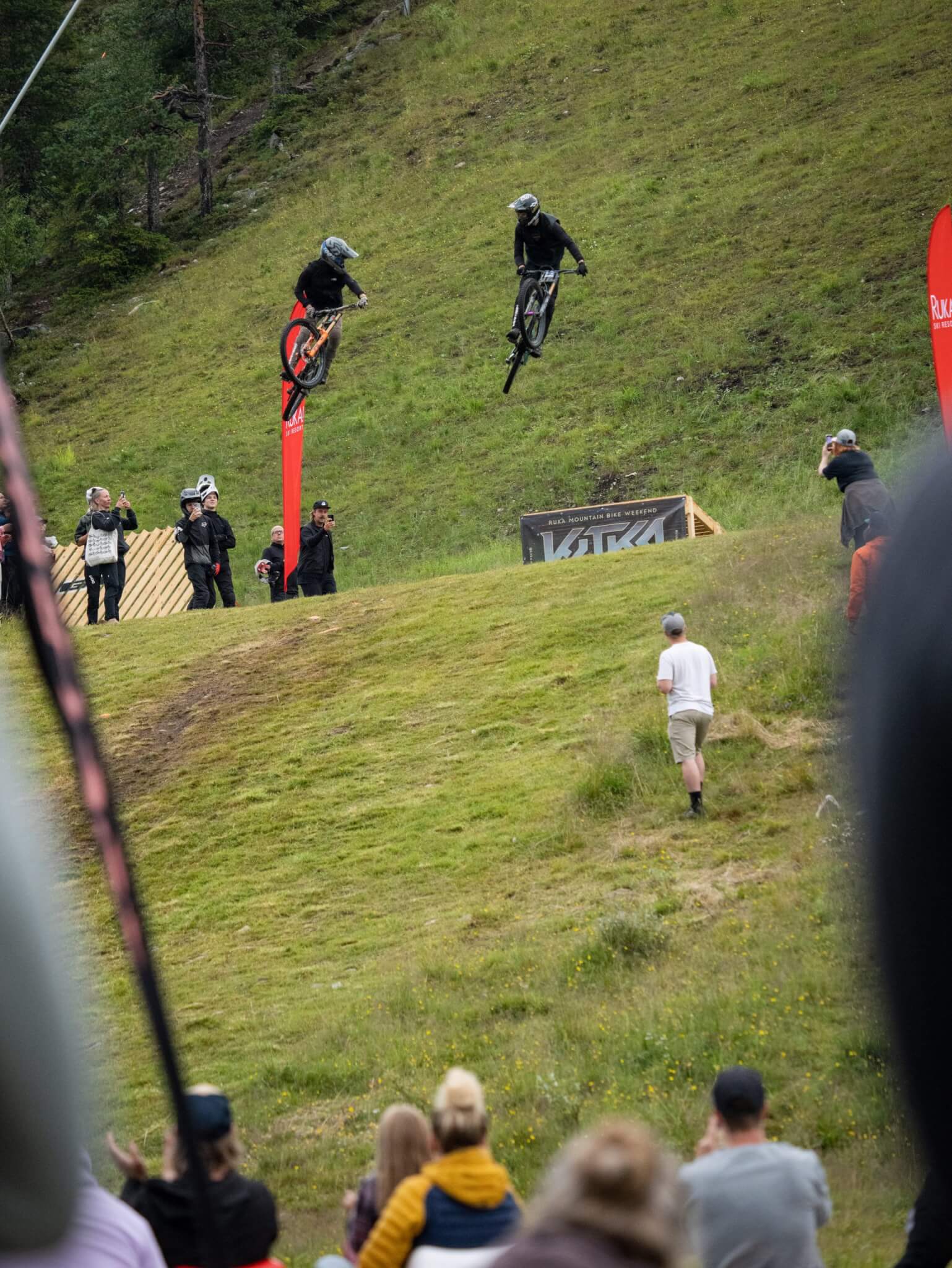 Hyppyjen jälkeen oli tapahtumaviikon ehkä ilahduttavin kilpailu, nimittäin Klunker race. Klunkerissa ajettiin vanhoilla klassikkopyörillä, jotka ehkä noin sata vuotta sitten olivat kovaa huutoa maastossa, mutta nykyaikaiseen mäkipyörään verrattuna ajo-ominaisuudet ovat hieman riisutummat. Siitäkin huolimatta mäkeä lähti uhmaamaan reilu kymmenen kuskia, joista arvottiin parit. Kuskit olivat radalla aina pareina, ja se joka selvitti mäen alas nopeammin, siirtyi seuraavalle kierrokselle. Kuulostaa yksinkertaiselle? Lisätään juoksulähtö. Märkää mutaa ja ruohikkomutkia. Kisan aikana nähtiin näyttäviä liukuja ja kaatumisia, hurjia pelastuksia ja taidokasta pyörän käskytystä.