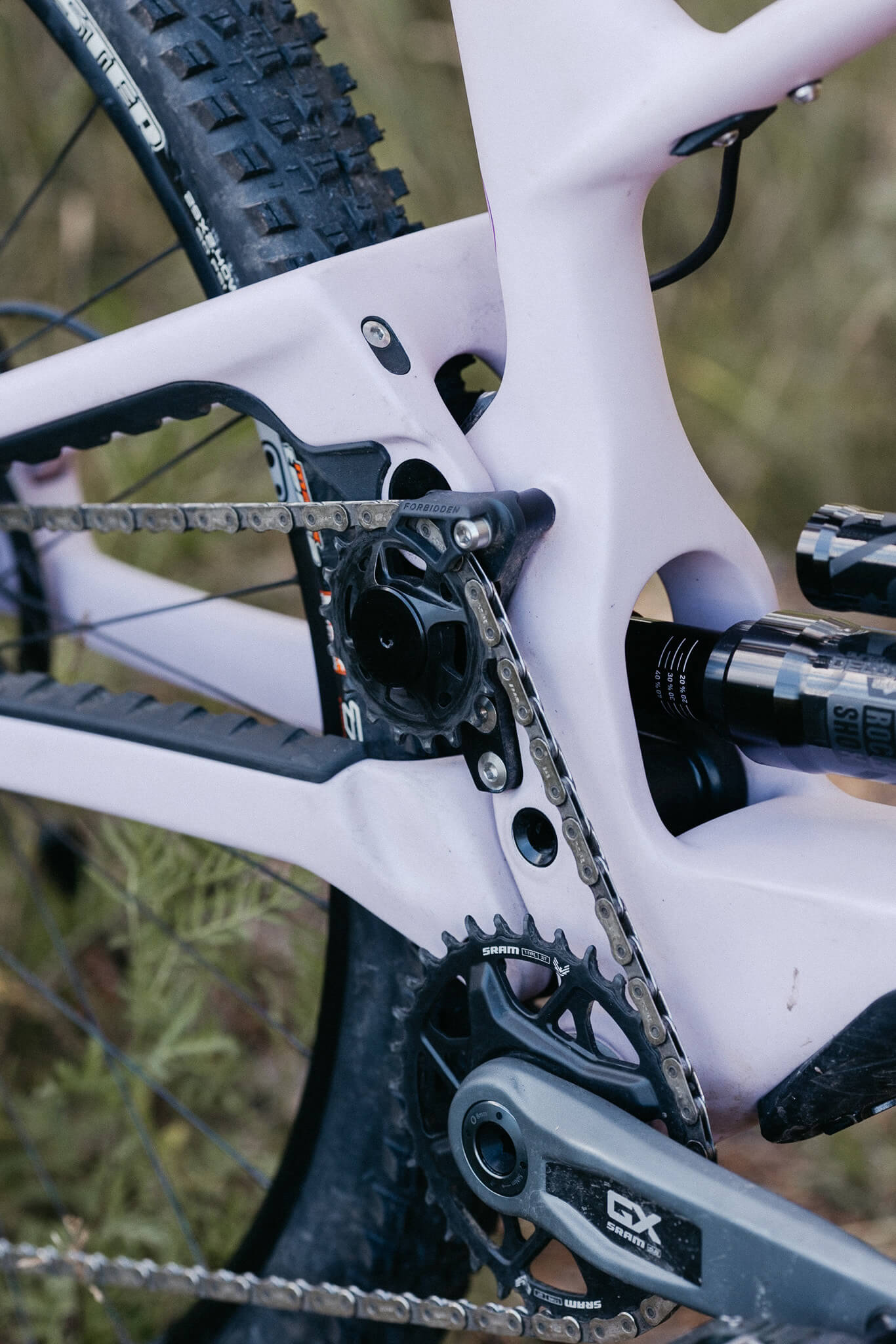 Forbiddenin malliston kaikki pyörät käyttävät samaa Trifecta -järjestelmää, jonka ilmeisimpänä tuntomerkkinä tai ominaisuutena on high pivot, eli suomalaisittain korkea pääakselipiste. Korkealla pääakselin sijainnilla pyritään siihen, että takapyörän akselirata kulkisi jousituksen kasaan painuessa taaksepäin, jolloin pyörän akseliväli kasvaa sitä pidemmäksi, mitä syvemmälle painutaan joustomatkassa. Tällaisella liikeradalla saavutetaan kaksi merkittävää hyötyä, jotka ovat selkeästi huomattavissa Druidilla ajaessa. Koetan seuraavaksi avata näitä hyötyjä tässä hieman kyseenalaisin termein, jotta linkuston toiminta hahmottuisi ehkä vähän kuvaavammin. Tämä saattaa aiheuttaa tieteellisempään termistöön tottuneilla niskakarvojen pörhistymistä. Pahoittelut jo etukäteen!