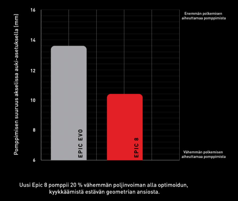 Specialized kertoo uuden Epic 8:n takajousituksen ratkaisun olevan edeltäjää parempi polkemistehokkudeltaan, vaikka joustomatkaa on tullut lisää. Epic 8:n takajousitus notkuu selvästi vähemmän, kuin edellisen sukupolven Epicillä, mikä parantaa poljinvoiman siirtymistä oikeaan paikkaan. Vähemmän notkuvasta takajousituksesta on helppo ajatella, että se saattaa olla vähemmän herkkä ja siten epämukavampi. Epic 8:n kerrotaan kuitenkin vaimentavan iskujen ja tärinän voimia 12 % enemmän, kuin edeltävä sukupolvi, mikä edesauttaa kuskin jaksamista. Mukavuus ilman notkumista kuulostaa juuri sellaiselta yhdistelmältä mitä XC-kuskit kaipaavat.