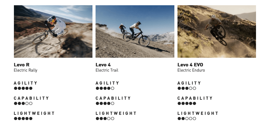 Sama moottori on koko Levo-perheessä. Pyörät erottaa toisistaan jousitusmatka, geometria ja tarkoitus.