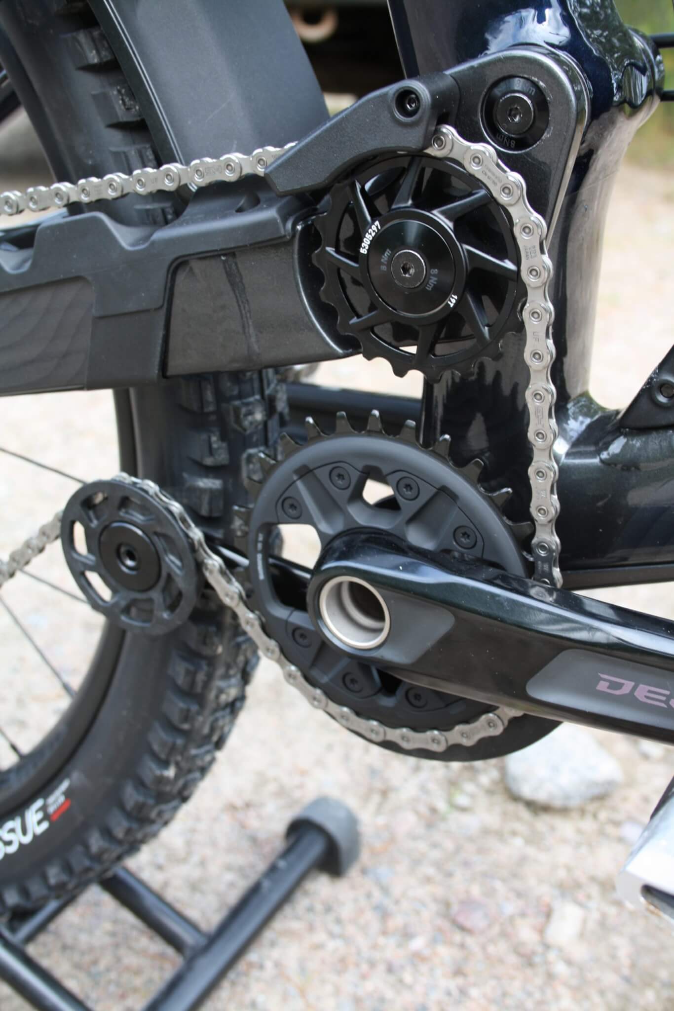 Trek käyttää tässä Slashissä kahta idleria, josta ylemmän tehtävä on vähentää pedal kick-backia kun ketju pitenee. High-pivot ratkaisussa tämä täytyy ottaa huomioon, koska perä on suunniteltu liikkumaan taaksepäin kun rengas kohtaa esteen. Ajatus high-pivotissa siis on, että pyörä kulkee jouhevammin kivikoissa ja juurakoissa. Idlerin koko ja sijoittelu parantaa polkemistehokkuutta. Alempi idler sen sijaan helpottaa vaihtajan toimintaa, kun se vähentää ketjun kasvua chainstayn alapuolella, ja näin myös vähentää sen vaikutusta jousituksen toimintaan. Ketjua näyttäisi menevän tähän systeemiin paljon, mutta itse asiassa tähän riittää katkaisematon normaali 126 linkin ketju. Vain XL vaati hieman pidemmän ketjun, eli 128 linkkiä. Trekin tiedotteen mukaan systeemi ei hankaloita mitään, vaan parantaa tätä pitkän historian omaavaa pyörää entisestään.