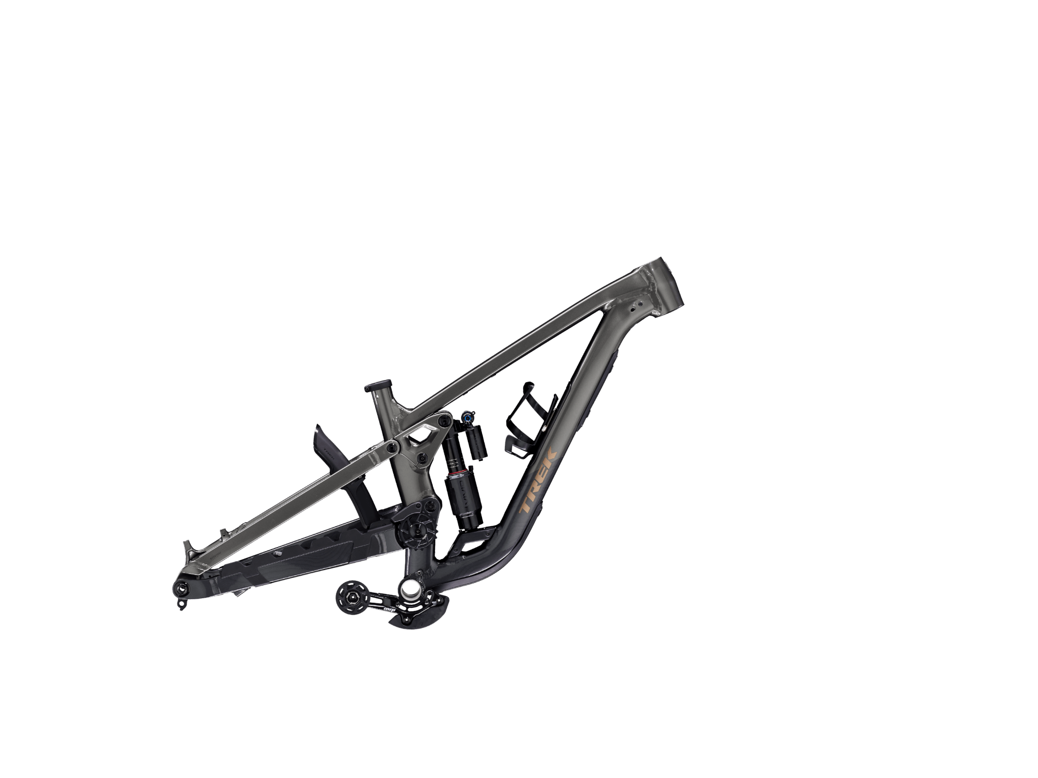 Keulakulma on tässä versiossa loivempi kuin ennen, ollen nyt 63,5 astetta. Keulakulmaa voi muokata asteen loivemmaksi tai jyrkemmäksi erikseen myytävän säätökupin avulla. Loivemman keulakulman lisäksi satulaputken kulma on uudessa versiossa silminnähden jyrkempi, kun vertaa Gen 5 ja Gen 6 Slashia vierekkäin. Satulaputki istuu nyt 77 asteessa, ja sen avulla polkemistehokkuus varmasti paranee. Chainstayn mitta vaihtuu myös koon mukaan, mikä on uutta verrattuna edeltäjäänsä. Trek on kuitenkin toteuttanut chainstayn mitan muutoksen fiksulla ratkaisulla sen kiinnityspisteen avulla, aivan kuten viimeisimmässä Sessioninkin versiossa – itse asiassa, chainstay on jokaisessa koossa saman mittainen, mutta perän mitta vaihtuu koon mukaan riippuen siitä, mille kohtaa chainstay on kiinnitetty. Näin Trekin ei myöskään tarvitse valmistaa varaosiksi monen erimittaista osaa, vaan sama osa käy kaikkiin kokoihin. Rungon muutoksista mainittakoon myös se, että uuteen Slashiin menee nyt noin 80mm pidempi hissitolppa, koosta hieman riippuen. Tämä on hyvä uudistus, sillä edellisen Slashin runko oli niin taivutettu, että lyhytjalkaisemmat kuskit saattoivat joutua vaihtamaan pyöräänsä lyhyemmän tolpan. Nyt tätä ongelmaa ei enää pitäisi olla. Ja hei, ilouutisia kaikille barspin –velhoille – knock blockia ei enää ole, joten barspinitkin onnistuvat, jos ohjaamosi setup sen muuten sallii! Ja kyllä, ainakin testissä olleeseen M-kokoiseen runkoon mahtuu vesipullo, vaikka ensivilkaisulla etukolmio näyttää hieman ahtaalle. Testasimme pullon mahtumisen 750ml pullolla ja hyvin istui.